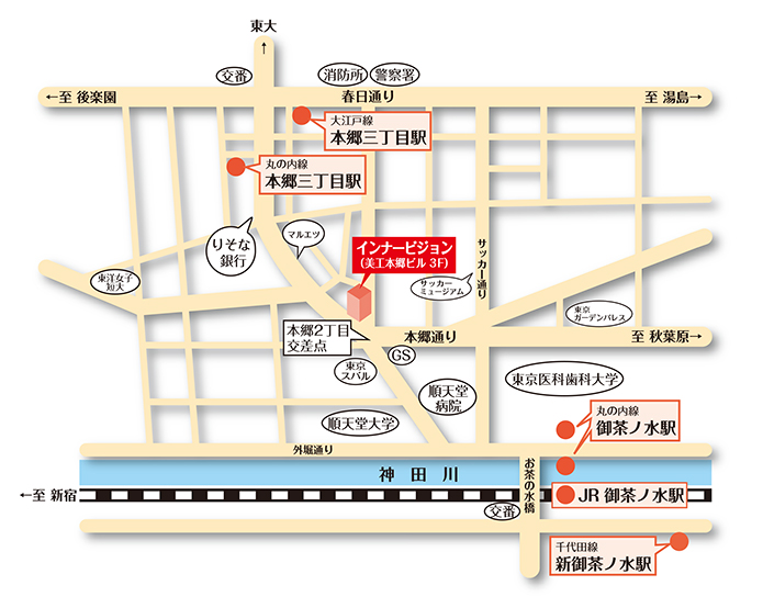 - 丸の内線 本郷三丁目駅 1番出口より徒歩3分