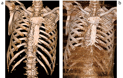 図8 VR画像(a)とsurface MIP画像(b)の骨折線と凹凸の描出能の違い