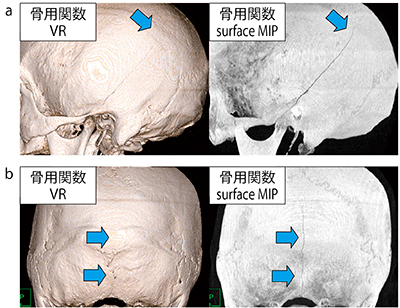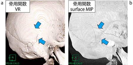 a:側頭骨骨折症例 b:後頭骨骨折症例