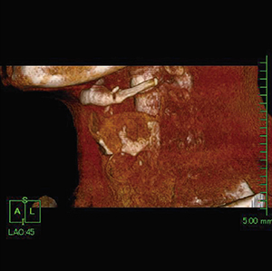 そこで,3Dフィルタを使用してオリジナル画像のノイズを低減させて,ボリュームの辺縁を滑らかに表示させる処理を行った。調整率によってフィルタのかかる割合が細かく設定でき,容易に画像確認を行うことが可能である(図5)。3Dフィルタによりノイズが低減されて辺縁が滑らかになったことで,輪状軟骨の左側壁部の骨折がより明瞭になり,内側に偏位しているのが確認できる(図6)。