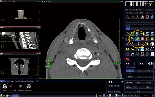 セミオート抽出機能(○)を使用し,ボリュームで抽出したい部分の輪郭を,何枚かのスライス上で設定する。各スライス上での輪郭設定後,抽出ボタンでマスク化を行う。