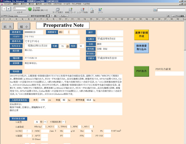 FileMakerの術前検査成績画面。CISからの検査結果の取り込みデータは,電子カルテの検査コードと結びつけてローカルに保存し,FileMaker側でのインポート後,ローカルファイルは消去される。