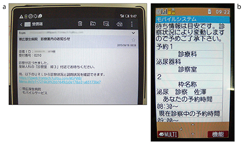 サービス内容の詳細としては,(1) 診察当日朝7時30分に予約があることをお知らせする「当日案内メール」(図3a),(2) 予定診察室の進行状況をブラウザで確認できる「診察状況Web」(図3b),(3) 診察直前に表示モニタへ番号が表示されたことをお知らせする「診察案内メール」を提供している。ここまではシステム標準機能を用いたものであり,(1) の当日案内メールは診察予約患者のみを対象とすることで,予約の優位性を図っている。登録されたメールアドレス自体は,最後の利用から1年半は自動的に有効となっており,次回以降のメールアドレス登録は不要である。