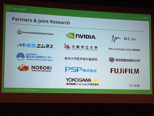 エルピクセル(株)は2018年4月12日(木),東京大学伊藤国際学術研究センター(東京都文京区)において,「最先端医療×AI〜医療画像診断の未来〜」をテーマにしたイベントを開催した。2014年に設立された同社は,人工知能(AI)を用いた画像解析ソフトウエア・システムを手がけるベンチャー企業として,近年急速に存在感を示している。画像診断装置・医療IT関連企業との協業を進めており,イベントを開催した4月12日(木)には,富士フイルム(株)が同社と提携し,画像診断支援技術をPACSに搭載するための開発を行うとアナウンスした。今回のイベントでは,同社代表取締役の島原佑基氏が事業展開についてプレゼンテーションを行ったほか,東京慈恵会医科大学放射線医学講座准教授/IT戦略室室長の中田典生氏,(株)エムネス代表取締役/霞クリニック院長の北村直幸氏が講演した。開会に当たって挨拶した島原氏は,今回のようなイベントを通してAIや医療の業界を盛り上げたい述べた上で,AIはブームではなく,これからの時代をつくっていくものであると強調した。