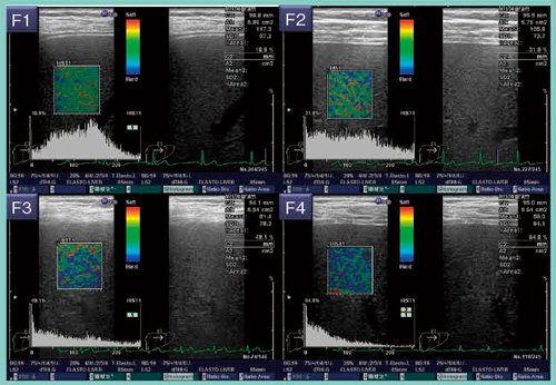 C型慢性肝炎の症例では,肝線維化が進行するにつれて青い領域が増え,テクスチャの乱れが生じることがわかる(図2)。藤本らも,青い領域をスコア化したLiver Elasticity Scoreと線維化に高い相関性があると報告している1)。