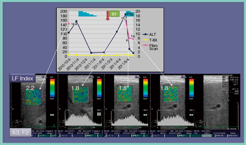 Shear wave imagingは,炎症や黄疸,うっ血の影響を強く受けることが知られている。炎症,黄疸,うっ血の影響をFibroScanがどのように受けるかについて,以下に症例を示す。