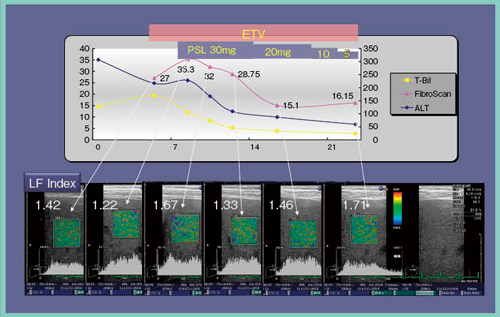 再燃が発見された時点では,ALT 200〜300U/L,ビルビリン 20mg/dl前後と高かったが,エンテカビル(ETV)とプレドニゾロンの併用により,ALTが漸減した。経過中,FibroScanは27,35.3kPaと非常に高い数値を保っていたが,治療により漸減し,15kPa前後をキープするに至った。この間,RTEは1.42から1.6,1.7程度のLF Index値であり,線維化は組織学的にはF2ないしF3であった。この症例でも,FibroScanは高すぎる数値を出してしまい,線維化を正確にとらえられなかった。