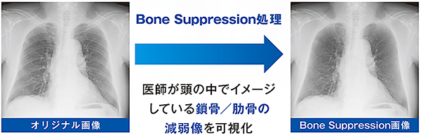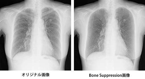 Bone Suppression処理は,独自の胸部X線画像データベースと解剖学的な情報・知識を利用した高度なアルゴリズムで,胸部X線画像から前方肋骨,後方肋骨,および鎖骨の信号成分を推定し,減弱する画像処理技術です。医師が頭の中でイメージしている,「鎖骨/肋骨の減弱像」を可視化することで,肺野内の骨に重なる病変の視認性を向上させ,「見えにくい病変の見落とし防止」を強力にサポートします。