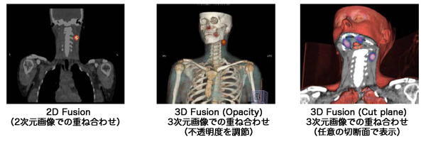 臨床的には,診断用CT装置の高精細な形態画像とSPECT装置の機能画像を重ね合わせることで,病変部の位置と機能をクリアに描出できるため(下図参照),脳血管障害や心疾患,がんの早期発見などにより高い有用性を誇る。