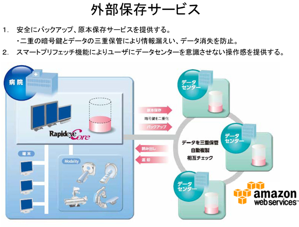 本サービスは,同社にてPACS(RapideyeCore™)の電子保存および運用管理を提供し,Amazon.com® の関連会社であるAmazon Web Services LLCが提供する,アマゾン ウェブ サービスを利用して(株)東芝が持つICTクラウド技術により顧客へ安心・安全な新しいソリューションを提供するもの。医用画像の外部保存サービスにおける2015年の国内市場が50億円と予測される中,同社は豊富なPACSの稼動実績をベースとし,2015年で外部保管サービスの売上25億円(シェア50%)を目指す。