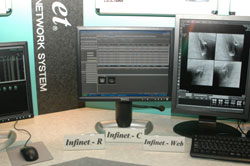 「Infinet」は,サーバを含めて,循環器科,放射線科,マンモグラフィなどの各種画像を総合管理する,マルチモダリティ対応のネットワークシステムです。患者さんの画像データや診療情報などを院外の紹介用に渡すためのCD/DVD Publisherもあります。既存のPACSと連携する,WEBブラウザベースの高機能画像ビューワ「Infinet-Web」により,低コストでフィルムレスシステムが導入できます。循環器系X線動画ネットワークシステムに関しては,国立循環器病センターなど,大規模な病院にも対応できるだけのキャパシティを持っています。