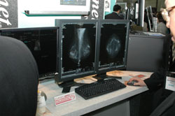 マンモグラフィ専用画像診断ワークステーション「mammary」は,10〜11ビット階調の高速表示を実現,ペア画像自動配列、大胸筋に沿ったシャッター機能や,左右同時に同じ場所を拡大する機能など,マンモグラフィ専用の画像処理機能が搭載されている。