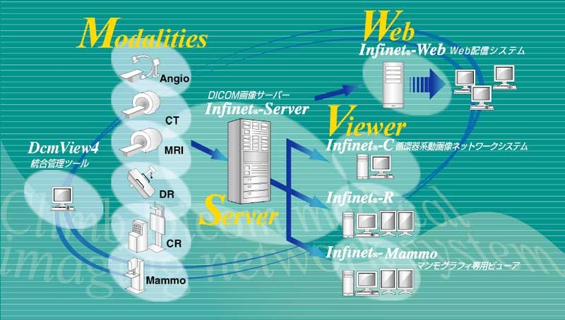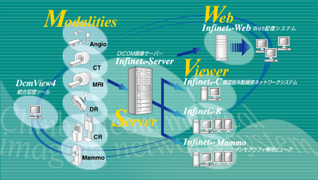 Infinet-Webは検査画像を院内で共有したいという要望を簡単に実現します。既設のネットワークやPC環境を利用して、当社PACSの保管画像だけでなく他社PACSやモダリティのDICOM画像も配信可能です。画像とともに自動配信される画像ビューワはDICOM形式のままで動画も表示でき、さらにオフライン状態でも参照できるので、ネットワークから外してベッドサイドでノートPCを使うこともできます。Web標準の規格に基づいて画像を配信しているため、他社の電子カルテシステムや病院独自のレポートシステムが呼出して連携することも可能です。