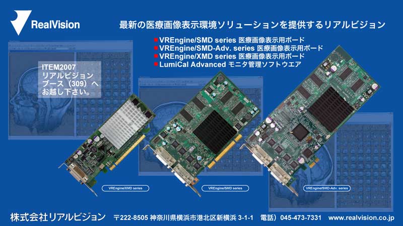 (株)リアルビジョンは、ITEM2007で最新製品である医療画像表示用ボードVREngine/XMDシリーズと、今回新たに発表するFVTパッケージ製品、FVT100及びFVT200を展示します。XMDシリーズは、高速の3次元表示に対応し、高いコストパフォーマンスを実現した医療画像表示用ボードのシリーズで、200万画素から300万画素のデジタルLCDモニタへの表示をデュアルヘッドでおこなうことが可能な、PC用グラフィックス・ボードです。医療画像表示のため最適化されており、ノイズの少ない画像を高精細に表示することが可能です。FVT100及びFVT200は、Fine