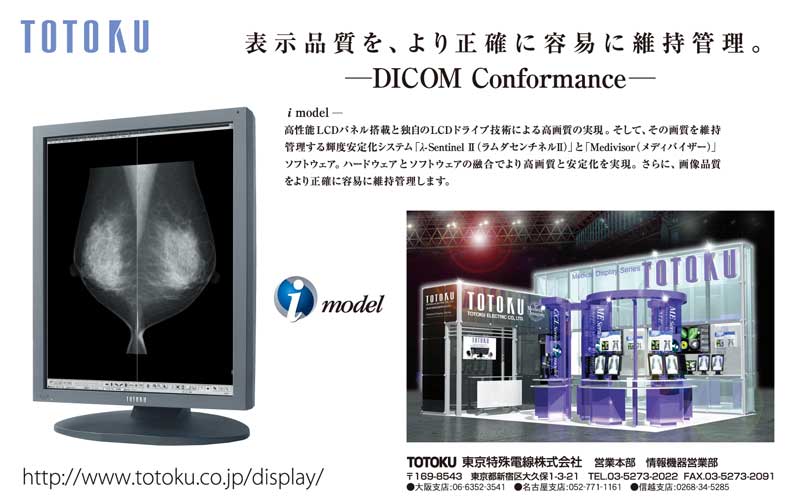 医用画像表示用ディスプレイ“i model”は、輝度センサーを画面上に直接設置する方式の輝度安定化システムを搭載することにより、バックライト輝度をセンシングする従来方式に比べ、より高精度な輝度安定化を実現しました。さらに、品質管理ソフトウェアと連携し、同一ネットワーク上にあるマネジメントターミナルから、内蔵の輝度センサーで収集した輝度データをもとに、ディスプレイの表示精度解析とリモートキャリブレーションの実行も可能とし、表示品質の維持・管理工数の大幅な削減を可能にしています。画質面では、輝度・コントラスト・視野角等に優れたIPS方式の液晶パネルの採用、ユニフォミティー補正機能や11.9bit(3826階調)のLUT搭載(モノクロームモデル)などで高画質化も実現しています。