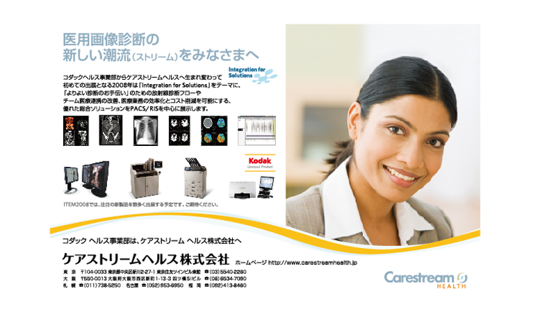 コダック ヘルス事業部からケアストリームヘルス株式会社に生まれ変わって初めてのITEM。大きな変化を皆さんにも感じ取っていただく為、PACS/RIS/IMSを中心とした医用画像情報ソリューションを中心にした展示を行います。テーマは “ Integration for Solutions “、「統合」「連携」をキーワードに、大きな反響を呼んだRSNA2007における成功と熱気をそのまま横浜へとお届けします。 医用画像診断の新しい潮流をご覧いただけるこの機会、皆様のご来場を心よりお待ちしております。