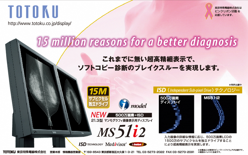 ■超高精細マンモグラフィ画像表示用ディスプレイ"MS51i2" "MS51i2"はISDテクノロジー(特許申請中)により、500万画素LCDにある1500万個のサブピクセルの独立表示による超高精細表示が可能です。また、X線フィルムのように締まった黒と鮮鋭度の高い表示を実現する特殊ARコート(特許申請中)も採用しました。"MS51i2"はこれらの新技術により、ソフトコピー診断のブレイクスルーを実現する製品となっています。 注)本製品には専用ビュワーソフトウェアが必要です。現在、対応するワークステーションは下記のとおりです。 "Infinet-Mammo mammary" (株)クライムメディカルシステムズ "Plissimo" パナソニックAVCメディカル(株)