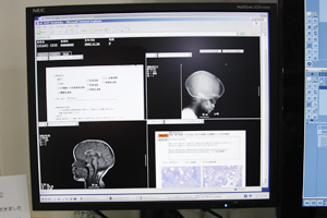 | 読影レポーティングシステム「Centricity i3」(セントリシティ・アイキューブ)では,患者さんの当日のレポートを選ぶと同時に,同一モダリティ,同一部位の過去レポートおよび,その患者さんがその日に行った検査の画像と同一モダリティ,同一部位の過去画像が同時に開くため,読影時に容易に過去比較読影を行うことができる。画面を分割して画像データ,検査の承諾書,レポートなどをすべて1画面に表示することもできる。 |