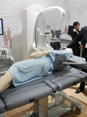 マンモグラフィは今回,Japanの“J”をキーワードに,特に日本にフォーカスした新機能が中心に紹介された。Senographe DS LaVerite には以前から,乳房の厚さと圧迫の圧力,乳腺の密度などから自動的に適切な線量を計算する“Automatic Optimazation Parameter(AOP)”が搭載されているが,これに加えて新たに“AOP-J”が搭載された。これは,日本人のデンスブレストな乳房に特化したプログラムであり,より高画質が得られるようになった。また,ワークステーション「SenoAdvantage2.1」には,瞬時にコントラストを最適化できるPremium Viewの新機能として,“Premium View-J”が搭載された。ウインドウ幅やウインドウレベルが自動で調整されるほか,モニタ診断だけでなくフィルム診断にも対応可能なパラメータとなっている。 |
