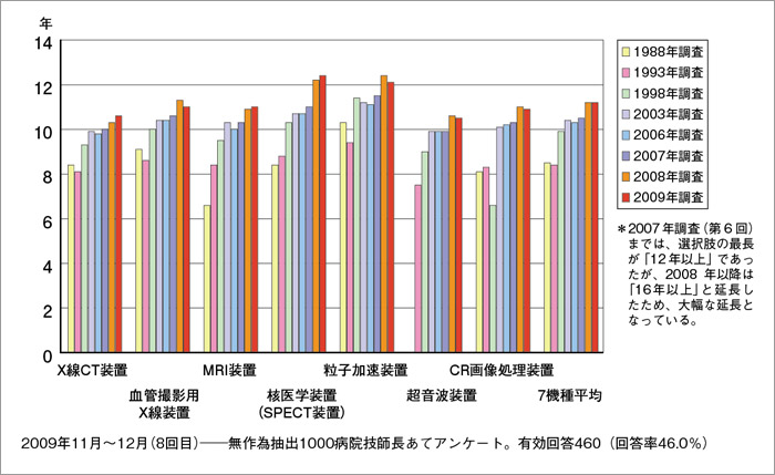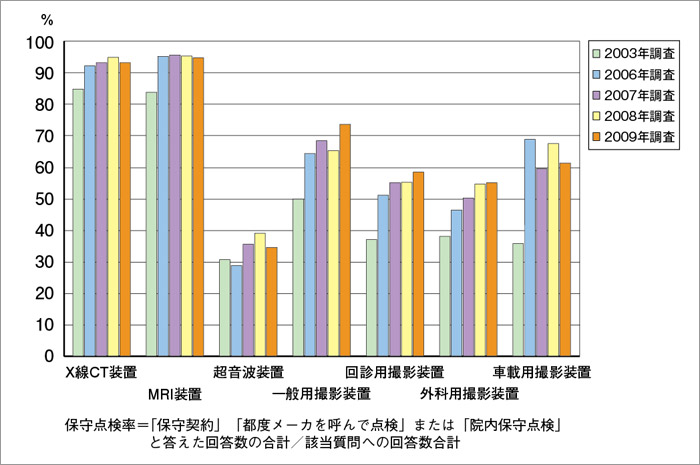また,2010年度改定では,「医療機器安全管理料」が1と2ともに増点されており,安全管理に対する評価が医療法や薬事法と整合がとれてきたという点で,評価しています。しかし,画像医療システムに関しては,まだ課題が残されています。JIRAでは毎年,「画像医療システム等の導入状況と安全確保状況に関する調査」を行っていますが,買い替え年数が長くなっているという結果が出ています(図1)。それにもかかわらず,保守点検実施率は決して十分なレベルにはありません(図2)。大型の装置の買い替え年数が延び,10年以上使用される状況で,保守点検はますます重要になってきています。今後は,この課題について,診療報酬でどのように対応するのか,議論していかなければいけないと考えています。
