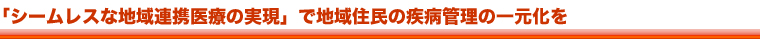 現状の地域医療は,病院,診療所ともに,本来の機能を発揮できていないところが多いのではないかと,私は考えています。病院で専門的な医療を受けるべき患者さんが診療所へ行っていたり,診療所に行くべき患者さんが病院に行っていたりということが,日本の各地域で起こっているのではないでしょうか。それをITを活用して地域住民の疾病管理を一元化し,病期ごとに適切な医療を受けられるようにすることが,「シームレスな地域連携医療の実現」の大きなねらいです。 |