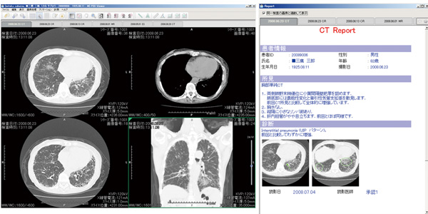 | PDI-Viewer を用いた画像(写真左)とレポート(写真右)の表示画面。Windows OS (Windows 2000以降)が搭載されているPCであれば,DICOM画像を表示,操作できる。PDI-Viewer上で,複数の検査画像やレポートの比較読影が可能なほか,読影レポートを画像と連携して表示させることが可能。福岡大学筑紫病院は,PDIメディアとして画像・レポートデータを出力したCD-Rで連携先施設に提供し,地域連携に役立てている。 |