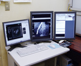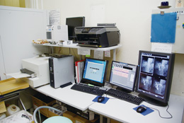 透視・撮影操作室。検像システムI-PACS QAが設置されている。一番右から,検像用の3Mモノクロモニタ,I-PACS QA,RISの端末となっている。フィルムをデジタル化するデジタイザや地域医療連携用のCD-Rを出力する装置も設置されている。 |