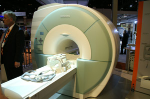 一方,3T装置では,MAGNETOM Verio(国内薬事未承認)が披露された。従来の3T装置に比べ,小型軽量化されており,大学病院,基幹病院以外の,今後販売ターゲットの中心となってくる中規模病院でも導入しやすくしている。開口径は70cmであり,被検者にとってもやさしい装置となっている。