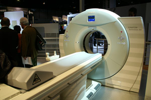 また,核医学分野では,SPECT/CTのSymbia T16(国内薬事未承認)が発表された。これは,16スライスのCTを搭載したもので,SPECT/CTとしては,最上位機種になる。また,PET/CTでは,biographに64スライスCTを採用し,がん検出だけでなく,心臓のイメージングにも有用な装置になっている。