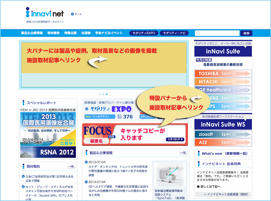 貴社製品を導入された施設を取材。実際に使用しているユーザーの声を交えながら,製品の特長,メリットを紹介します。インナービジョン誌の掲載と,特設バナーを設け,インナビネット上で公開します。