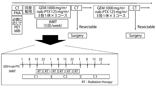 図1 当院の局所進行膵臓がんに対する術前化学放射線療法:PhaseⅠ/Ⅱ臨床試験のプロトコール