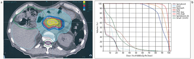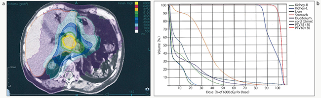 図2 局所進行膵臓がんの症例 a:線量分布図 b:DVH