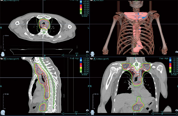 Radixactは,IMRTはもとより40cm以上にわたる長い病巣に対しても,つなぎ目のない放射線治療が可能である。このことによって,頸部や腹部リンパ節まで進展した食道がん(図1)や,上頸部まで転移のある肺がん,通常の放射線治療では根治照射が難しい両側頸部リンパ節転移のある進行がんに対しても,根治治療が比較的容易に計画できるようになった。病巣の進展によっては根治治療を断念せざるを得ない症例にも根治的放射線治療が可能になったことは,長く放射線治療にかかわってきた身としては非常にありがたく,うれしいことである。