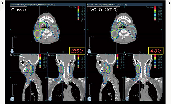 頭頸部は複雑な形状のため,従来の最適化プログラム(Classic)では266分かかる線量計算(a)が,VOLO Ultraを利用することにより,4.3分で同等の線量分布(b)が得られている。