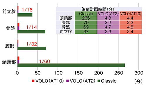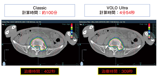 VOLO Ultraを使うことで,従来の最適化プログラム(Classic)での計算時間(約100分)の約1/20の4分54秒で完了し,放射線治療時間も309秒と約3/4に短縮できた。