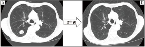 患者背景を表1にまとめて示す。年齢中央値は77歳であり,これは治療法が外科,内科,放射線科合同カンファレンスで議論され,放射線治療に紹介される患者は手術不能の高齢者が多いことを反映している。そのほかの患者背景としては,線量は91名が54Gy/3frで,5名が60Gy/3frであり,BEDの中央値は151Gyと高線量を使用していることが特徴である。しかしながら,肺V20の中央値は2.4%であり,肺線量はきわめて低く,GTV D99の中央値は101.4%,PTV D95の中央値は95.6%と標的に対する線量のカバーは十分であると考えている。このような集団の治療結果として,観察期間中央値27か月で2年局所制御率97%,2年生存率90%であった。Grade2以上の肺臓炎は6%,Grade3以上の肺臓炎が1%であり,肺臓炎発症率はきわめて低い。代表的症例の治療経過を図2に示す。