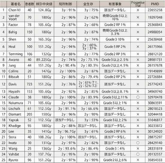 PubMedで“CyberKnife,Lung Cancer”と検索したすべての結果から,早期肺がんに対する治療成績を手動で絞り込んだ。まとめると線量BED中央値=141Gyで,2年局所制御率76〜100%,2年生存率60〜93%,肺臓炎はGrade2以上が0〜11%,Grade3以上が0〜11%であった(表2)。