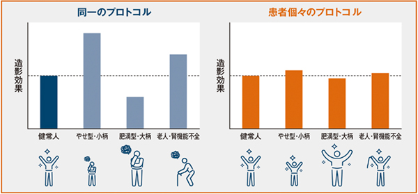 正確な読影のためには,患者さん一人ひとりに最適な造影プロトコルを設定し,画像コントラストを標準化することが求められていますが,体格や腎機能,管電圧などの多くの因子をもとに個々のプロトコルを設定するには複雑な計算と時間を要するため,患者さんごとにパーソナライズしたプロトコルを日常業務で設定するのは困難でした。