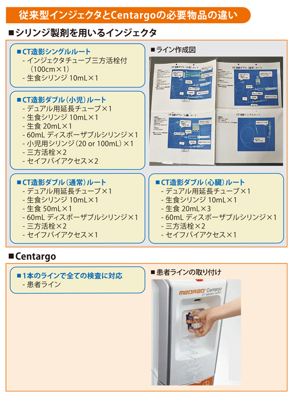 例えば、心臓検査の場合には、デュアルの延長チューブを準備する。その際、ルート内のエアを手動で抜く。当院では三方活栓を使用するため、どうしても接続部分にエアが溜まりやすい。その部分のエアを抜くのに手間がかかる。生食の用量も、検査の種類、小児か成人かによって異なり、さらに用意する物品も異なる。物品を1つ1つ確認してからの作業になる。しかし、Centargoの場合は、どのような検査においても短い50cmラインを作成するだけであるため、作業効率の差はとても大きいと感じられる。これらの要因によって、Centargoの導入後、CT室の看護師配置人数は2人から1人に低減できた。