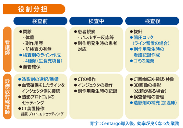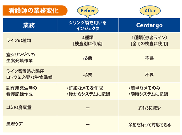舩本 看護師長 看護師は、1)造影CT検査のライン確保、2)造影CT検査中の患者観察、3)副作用が発生した場合の患者の初期対応が主な役割である。「過去に造影検査をしたことがあるから大丈夫」と言われる患者も多い。そのため、看護師は「アレルギー反応は、複数回目に突然起こる可能性がありますよ」と説明を行い、検査前後に水分を十分とるようにお願いしている。患者の中には、検査前は「絶食」と言われると、水分まで摂取されない方がおられる。その為、水分摂取は可能であることを患者に伝えている。さらに、同日に内視鏡検査の予定がある場合、絶飲食になっていることもあるため、その他の検査の情報を確認する必要がある。造影CT検査後に内視鏡検査が予定されている場合は、検査後に水分摂取を行ってはいけないため検査前に丁寧に確認することを心がけている。「シリンジ製剤を使用する場合には、様々な要因で時間の余裕はない。」しかし、Centargoを導入してから、これまで以上に患者の介助や事前に話を聞いたりする時間の余裕ができている。さらに、患者に副作用が出た場合、以前は看護記録を記載する時間的余裕を作るのが難しかった。しかし、今は、すぐに看護記録へ詳細なレポートが書けるほど、時間に余裕ができた。