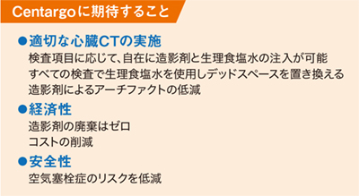 そのため、後押し用に生理食塩水(生食)を空シリンジに充填する時間的な手間を省くことができるCentargoは、患者の待ち時間を減らして検査数を増やすことができるのみならず、スタッフのワークフローも大きく改善した。