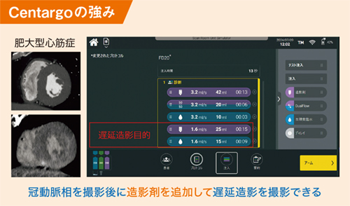 心臓CTを構成する、冠動脈・心筋perfusion・遅延造影検査において、よりカスタマイズした造影剤プロトコルを組めるのがCentargoの最大のメリットである(図3,4,5)。