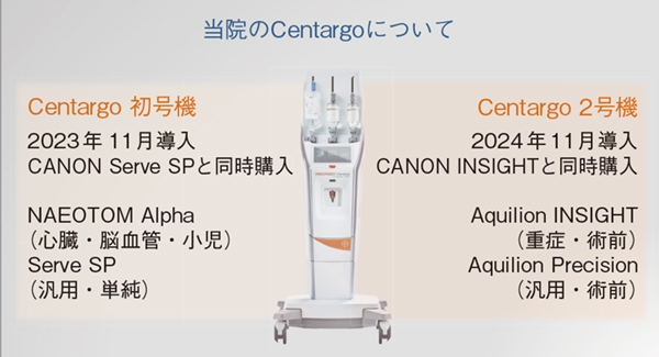 さらに,2024年11月に320列CT「Aquilion ONE/INSIGHT Edition」(キヤノンメディカルシステムズ)と同時に2台目のCentargoを導入し,同装置と「Aquilion Precision」(キヤノンメディカルシステムズ)での併用を開始した。