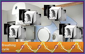 肺がんのSRTでは,腫瘍の呼吸性移動が問題となる。そこで,CBCTの四次元化(4D-CBCT)が考案された(図1)。ワークステーション上で投影画像を横隔膜のレベルで呼吸位相ごとに10位相(図1では模式的に4位相)に分けて重ね合わせることで各位相の三次元画像を得,さらに,それらをムービー表示することで4D-CBCTが得られる。