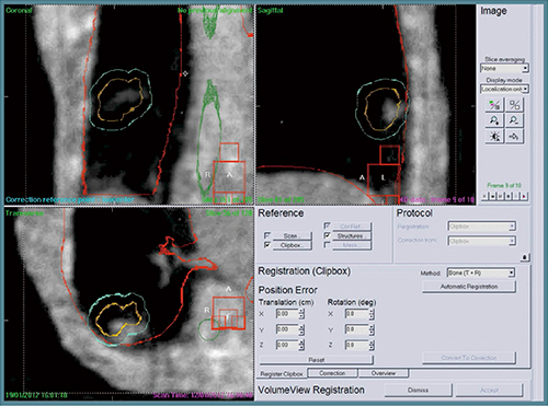 その後,エレクタ社は,前述の4D-CBCTを基に腫瘍の位置や呼吸性移動を確認し,治療寝台位置の調整を行うことで正確な放射線治療を可能とするソフトウエア“XVI Symmetry”(以下,Symmetry)を商品化した。治療計画時の3D-CT画像におけるITV,PTVと治療直前の4D-CBCTとをSymmetryによりレジストレーションし,画像のズレを目視で補正している(図2)。