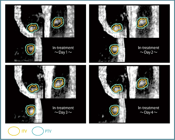 当院では現在,FFF VMAT-SRT+4D-CBCTの臨床応用を開始しており,5症例(2014年12月8日現在)に対して施行した。220°回転にて95秒で13.75GyのFFF VMAT-SRT+4D-CBCTが施行できており,治療中の腫瘍の動きもPTV内にほぼ収まっていることを確認している(図6)。