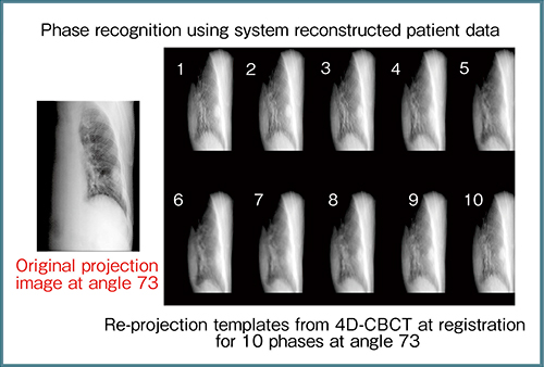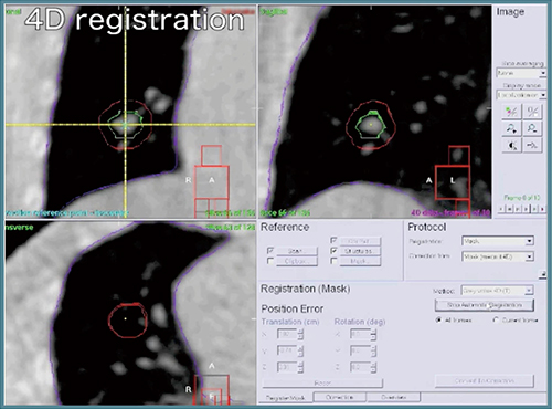 エレクタ社が上記の方法でCBCTの四次元化を図ろうとしていた頃,われわれも独自に四次元化の研究に取り組んでいた。隣接する投影画像上の肺腫瘍画像の相互相関を計算することにより,CBCTデータを四次元化した。本法を10名の患者に対して適用したところ,すべての症例において内的標的体積(以下,ITV)に5mmのマージンをつけたPTVの中に治療中の腫瘍の移動範囲が収まっていることが確認できた1)。