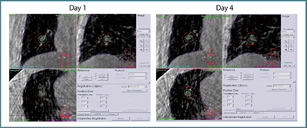 当院の治療の流れを図3に示す。治療計画においては,まず呼吸抑制を行い,治療計画用CTで10位相の4D-CTを撮影し,それぞれについて肉眼的腫瘍体積(以下,GTV)の輪郭をとり,それを基にITVを作成する。さらに,5mmのマージンを加えてPTVとする。線量処方はD95とし,55Gy/4分割(1回線量は13.75Gy)で照射を行う。線量計算は最大呼気位相のCT上で行っており,使用X線エネルギーは6MVとしている。次に,治療直前に毎回必ず10位相の4D-CBCTを撮影し,Symmetryで治療計画用4D-CTとのレジストレーションを行う。そして,治療中のCBCTを撮影し,自作ソフトウエアにて再構成した4D-CBCTを治療計画システムに転送して位相ごとに腫瘍の局在,ITV,PTVとの関係を確認し,適切に腫瘍に照射されているかを検証する。これにより,複数日にわたり治療中の腫瘍の位置がPTV内に収まっていることが確認可能であり(図4),きわめて有用である。