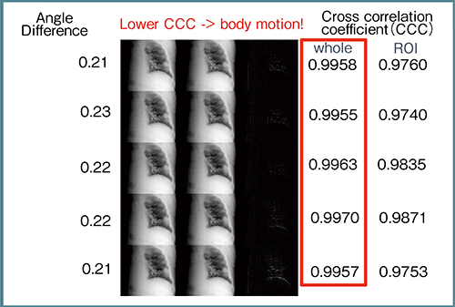 図10は,実際の症例の投影画像を約0.2°ずつ回転させて並べたものであるが,腫瘍の位置は実はそれほど変わっていない。相関関係をとってみると,画面全体で相互相関係数が0.99をはるかに上回っており,かなり一致している。つまり,この相関値が下がった場合,患者が動いているということになる。したがって,この投影画像をリアルタイムに出力して直前の投影画像と比較することで,体動の有無や息止めが保たれているかどうかを確認することができる。