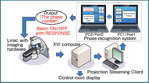 また,別の考え方として,図11は別の症例におけるガントリ角73°での投影画像である。レジストレーション時の4D-CBCTデータから投影画像を再構成して10位相の三次元CBCT画像を作成し,これをテンプレートとして用意する。その上で,リアルタイムに出力された投影画像がこの10位相のうちのどれに相当するかということを相互相関係数をとって確認すれば,治療中に何もデバイスを使用せずに画像から呼吸曲線を描くこともできる。このテンプレートマッチングにはCross Correlation Coefficient,Structure Similarity Index,Mutual Informationといった手法があるが,ガントリ角73°ではいずれの手法でも実際の呼吸位相と予測した位相の一致度は高く,100°では完全に一致しており,かなり有望な方法であると考えている。また,これにより,体動の有無や息止めが保たれているかどうかを確認することができる。そして,このような位相認識システムは今後,画像の確認から治療の制御へと技術開発の方向性が変化していくと考えられる(図12)。